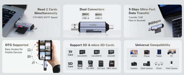 Podržava istovremeno čitanje dve kartice za brzo i jednostavno pristupanje fajlovima na laptopovima, tabletima i telefonima.