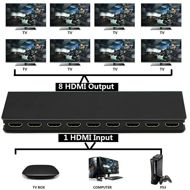 Mini 1×8 HDMI Splitter koristi jedan HDMI izvor pristupajuc´i višestrukim HDMI prijemnicima. Omoguc´ava da se jedan HDMI uređaj lako podeli na osam HDMI kompatibilnih ekrana ili projektora. Rezolucija ovog hdmi razdelnika može biti do 3840x216030Hz. KARAKTERISTIKE Podržava 3D video format Podrška visoke rezolucije do 3840x216030HZ Podržava najvec´u brzinu od 3.4G i TMDS takt može biti do 340MHz Podržava 81012 bit duboke boje Podrška za standardni AVG26 HDMI kabl 1 kada je rezolucija 1080p i niža ulaz do 15 metara izlaz do 15 metara. 2 kada je rezolucija 4K ulaz do 8 metara izlaz do 8 metara. Podržava jedan HDMI izvor pristupite više HDMI izlazima izvor može biti DVD plejer AV risiver set top box itd. Paket uključuje 1. HDMI razdelnik x 1 kom 2. Adapter za napajanje x 1 kom 3. Uputstvo za upotrebu x 1 kom