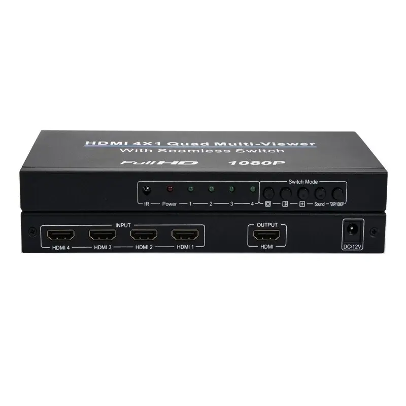HDMI 4×1 Quad Multi-Viewer sa besprekidnim preklapanjem i daljinskom kontrolom – Full HD 1080p Opis HDMI 4×1 Quad Multi-Viewer je visokoperformansni uređaj za istovremeni prikaz četiri HDMI izvora na jednom ekranu uz mogućnost besprekidnog seamless preklapanja. Pruža razne režime raspodele slike i sinhronizovano prebacivanje između 4 HDMI ulaza. Uređaj se može kontrolisati dugmadima na kućištu ili putem IR daljinskog upravljača. Praktičan je stabilan i jednostavan za instalaciju – idealan za prezentacione sisteme konferencijske sale i druge profesionalne primene. Karakteristike Podržava 4 HDMI ulaza i 1 HDMI izlaz Podrška za prikaz slike iz 4 HDMI izvora na jednom ekranu Besprekidno seamless prebacivanje između HDMI signala Maksimalna podržana rezolucija 1080p60Hz IR daljinsko upravljanje uključeno Kompatibilan sa HDMI 1.3a HDCP 1.2 DVI 1.0 Podržane rezolucije 1080p 720p 1080i 1024×768 1360×768 itd. Podržani audio format PCM2 Podržava standardni AWG26 HDMI kabl – ulaz i izlaz do 15 metara Napajanje DC 12V1A Neto težina 460 g Dimenzije D x Š x V 200 x 93 x 20 mm Paket sadrži 1 x HDMI Multi-viewer uređaj