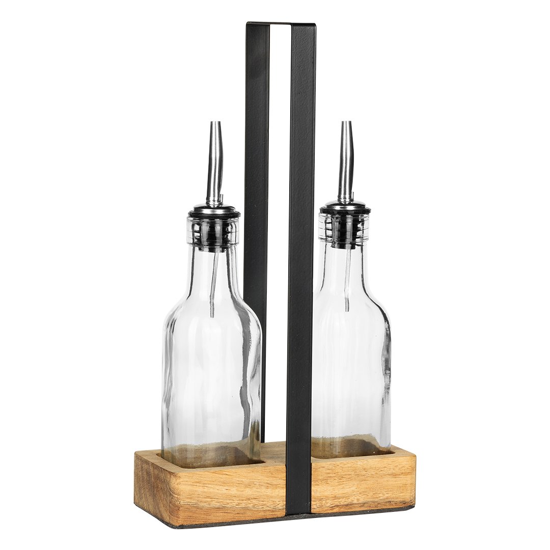 Materijal: staklo (bočice), drvo (podloga), nerđajući čelik (drška) • Sadržaj seta: bočice za ulje i sirće sa drvenom podlogom • Namena: serviranje ulja i sirćeta • Poklon pakovanje