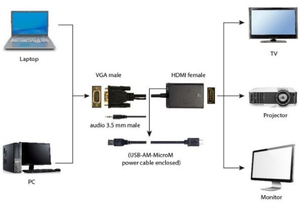 Povežite VGA uređaj(laptop, racunar, DVR, settop box..) sa HDMI monitorom, TV-om, projektorom.