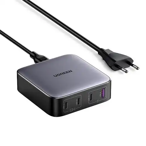Ugreen Nexode brzi stoni punjač GaN 3 x USB-C 1 x USB-A 100W sivi CD328 Pređite na rešenje koje c´e vam omoguc´iti da punite 4 uređaja istovremeno Univerzalni brzi punjač c´e moc´i da napuni vaše uređaje za vrlo kratko vreme što ga čini idealnim izborom za rad u kancelariji ili kod kuc´e. Ukupna snaga punjača je do 100W. Zahvaljujuc´i korišc´enoj GaN tehnologiji punjač ima relativno malu veličinu i povec´anu efikasnost u odnosu na klasične punjače. Model CD328 ima podršku za protokole brzog punjenja uključujuc´i Power Delivery Quick Charge što ga u isto vreme čini bezbednim za korišc´enje. Proizvođač je opremio punjač kablom za napajanje. Specifikacija Brend Ugreen Model CD328 Siva boja Snaga punjača 100W max. Napajanje ulaz 100-240V 50-60Hz Snaga izlaz – 1 port USB-C1 PD 100W USB-C2 PD 100W USB-C3 PD 22.5W USB-A SCP 22.5W QC 18W Snaga izlaz – 2 porta UUSB-C1 + USB-C2 PD 65W + PD 30W USB-C1 + USB-C3 PD 65W + PD 22.5W USB-C1 + USB-A PD 65W + SCP 22.5W QC 18W USB-C2 + USB-A PD 65W + SCP 22.5W QC 18W USB-C2 + USB-C3 PD 65W + PD 22.5W USB-C3 + USB-A 5V 2.1A + 5V 2.1A Snaga izlaz – 3 porta USB-C1 + USB-C2 + USB-C3 PD 45W + PD 30W + PD 22.5W USB-C1 + USB-C2 + USB-A PD 45W + PD 30W + SCP 22.5W QC 18W USB-C2 + USB-C3 + USB-A PD 65W + 5V 2.1A + 5V 2.1A USB-C1 + USB-C3 + USB-A PD 65W + 5V 2.1A + 5V 2.1A Snaga izlaz – 4 porta USB-C1 + USB-C2 + USB-C3 + USB-A PD 45W + PD 30W + 5V 2.1A + 5V 2.1A Važno Ako je više uređaja povezano istovremeno povezivanje novog uređaja ili odvajanje uređaja od punjača može izazvati kratak prekid u punjenju drugih uređaja. To je zbog toga što punjač preraspoređuje snagu koji inteligentno prilagođava izlaznu snagu kako bi zaštitio povezane uređaje.