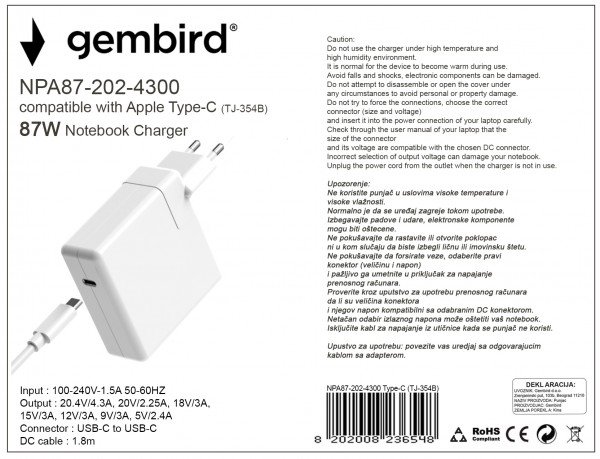 NPA87-202-4300 (TJ-354B Apple Type-C/USB-C) Gembird punjac za MacBook 87W-20,2V-4.3A, USB Type-C