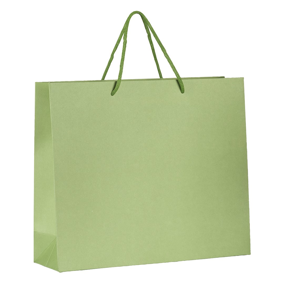 Horizontalna papirna kesa • Materijal: papir 170 g/m2 • Mat završna obrada • Pletene papirne ručke od 100% papira • Ravno sečen gornji rub • Ojačano dno kartonskim uloškom • Čist i neutralan izgled • Pogodna za retail, poklon pakovanja i promocije