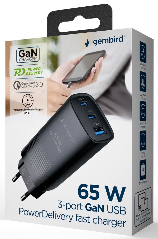 3-portni 65W GaN USB PoverDelivery brzi punjac, crni