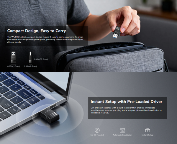 -Kompaktan USB adapter sa dvostrukim opsegom koji podržava Wi-Fi 6, pružajuci visokobrzinski rad sa niskom latencijom za glatko online igranje i brza preuzimanja na vašem gejmerskom PC-u ili laptopu.