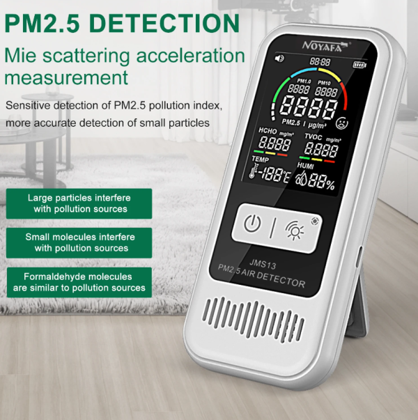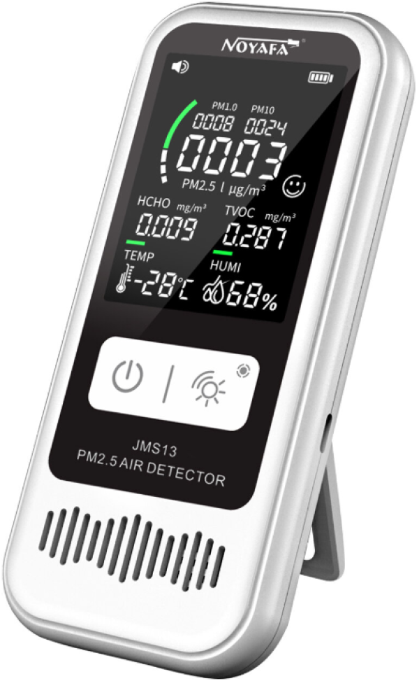 – Noyafa JMS13 detektor kvaliteta vazduha – meri prisustvo čestica PM1.0 / PM2.5 / PM10, TVOC, HCHO, formaldehida, meri temperaturu i vlažnost, alarm u slučaju nezdravog vazduha, USB-C punjenje, baterija, LCD displej