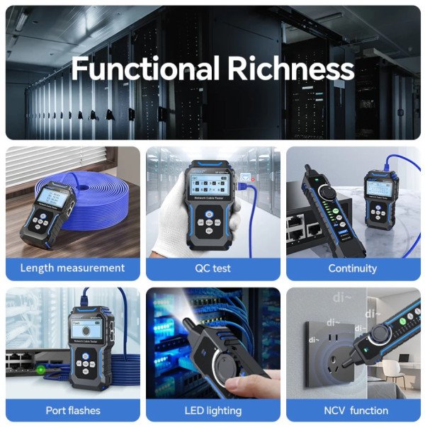 -Merenje dužine: precizno meri dužinu kablova do 500 metara pomoću TDR tehnologije.