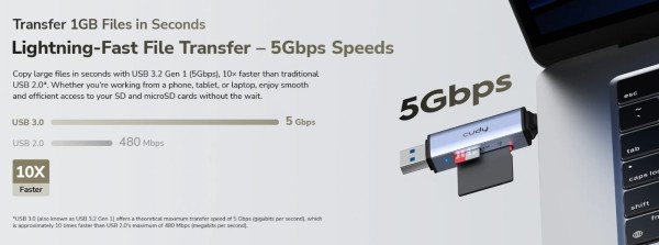 Podržava istovremeno čitanje dve kartice za brzo i jednostavno pristupanje fajlovima na laptopovima, tabletima i telefonima.