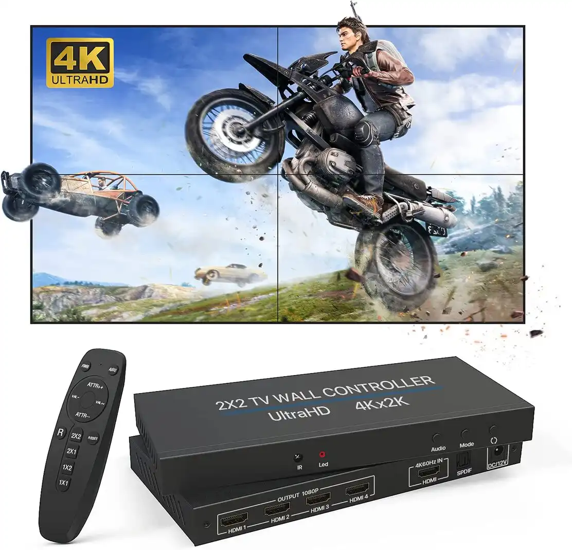 Karakteristike 1 HDMI video zidni kontroler podržava režim spajanja vise ekrana u jedan ekran jednosmerni ulaz HDMI V1.4 signala četiri izlaza HDMI signala može se postaviti u režim 2×2 može se postaviti i 2×1 3×1 4×1 1×2 1×3 1×4 i drugi režima. 2 Prezentacija slike visoke definicije podrška za ulaz i izlaz slike visoke definicije 1080P predstavljajuc´i vizuelni doživljaj visoke definicije. 3 Nema potrebe za drugim softverskim podešavanjima hardverskim uređajima jednostavnim podešavanjima podrškom za modifikovanje režima korišćenja pomoc´u dugmeta nakon što se mod modifikuje uređaj treba isključiti da bi se uređaj ponovo pokrenuo. Napravite veliki 2 x 2 video zid- 2×2 video zidni kontroler vam omoguc´ava da kreirate privlačne video zidove velikog formata i ekrane za digitalnu signalizaciju putem LCD ekrana za spajanje. Do 8 režima prikaza po vašem izboru. Samo u režimu 2×2 može da se rotira. Laka instalacija i rad -Uključite i igrajte nije potreban upravljački program. Za jednostavnu kontrolu obezbeđen je daljinski upravljač a možete i direktno pritisnuti dugmiće na uređaju. Rotacija za 180 ° za HDTV -Ako koristite HDTV kao ekran omoguc´ava vam da rotirate ekran za 180 °. Uzbudljivo je što televizore možete postaviti u orijentaciji sa najtanjim ivicama. Ekran od 19201080P60Hz- I HDMI ulaz i izlaz podržavaju prikaz do 19201080P pri 60 Hz. Kompatibilni sa računarom laptopom televizijskim prijemnikom DVD plejerom PS34 mogu biti savršeni izvori signala. Podržani audio formati PCM 2.0 nisu podržani Dolbi Digital i DTS. HDMI verzija v1.4 Ulazna udaljenost 5m Napajanje 12V 1A Rezolucija 1920 x 1080 60Hz Izlazna udaljenost 10m Paket sadrži 1. 2×2 Zidni kontroler za TV x 1 2. Adapter za napajanje x 1 3. Uputstvo za upotrebu x 1 Kada je ulazni uređaj 4K prikazuje se 1080P.