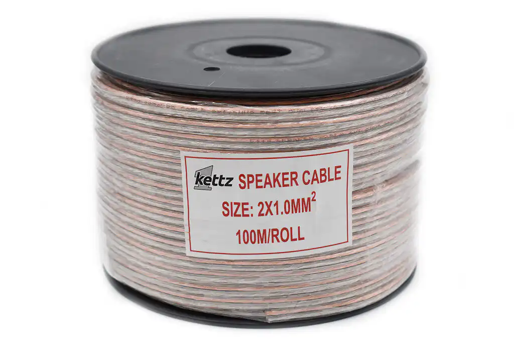 Zvučnički kabl Brend Kettz 2×1.00 Model ZK-100 100mROLL Izolacija Transparentna Presek kabla57 niti od 0.15 mm u jednom kanalu Pakovanje100 m kotur Dimenzije2 x 1.00 mm2