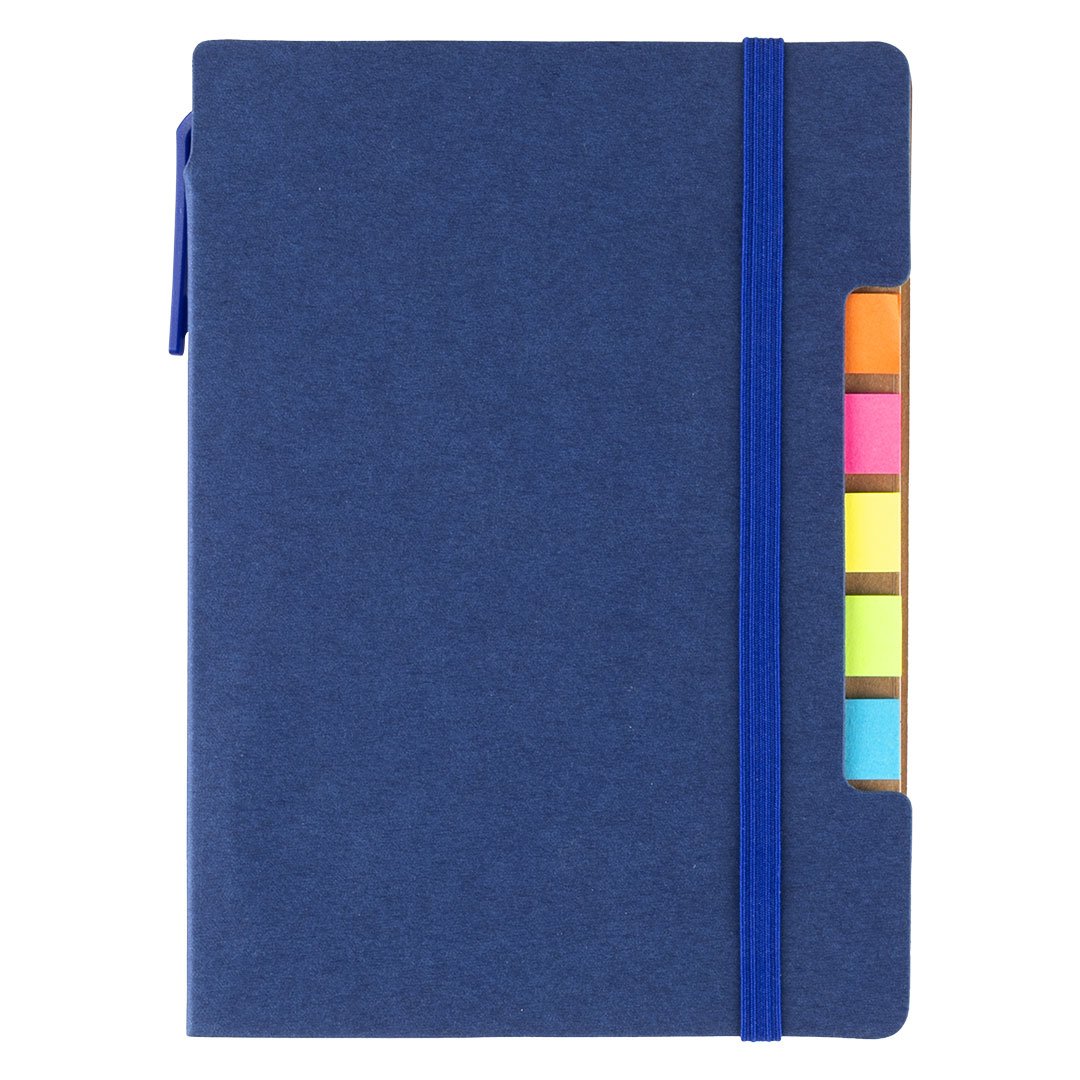 Set za beleške • 70 listova sa linijama • 100 samolepljivih papirića (20 po boji) • Boje: roze, narandžasta, žuta, zelena, plava • Hemijska olovka sa recikliranim delovima sa plavim mastilom • Unutrašnji džep u korici • Elastična traka za zatvaranje • Dostupan u 7 boja