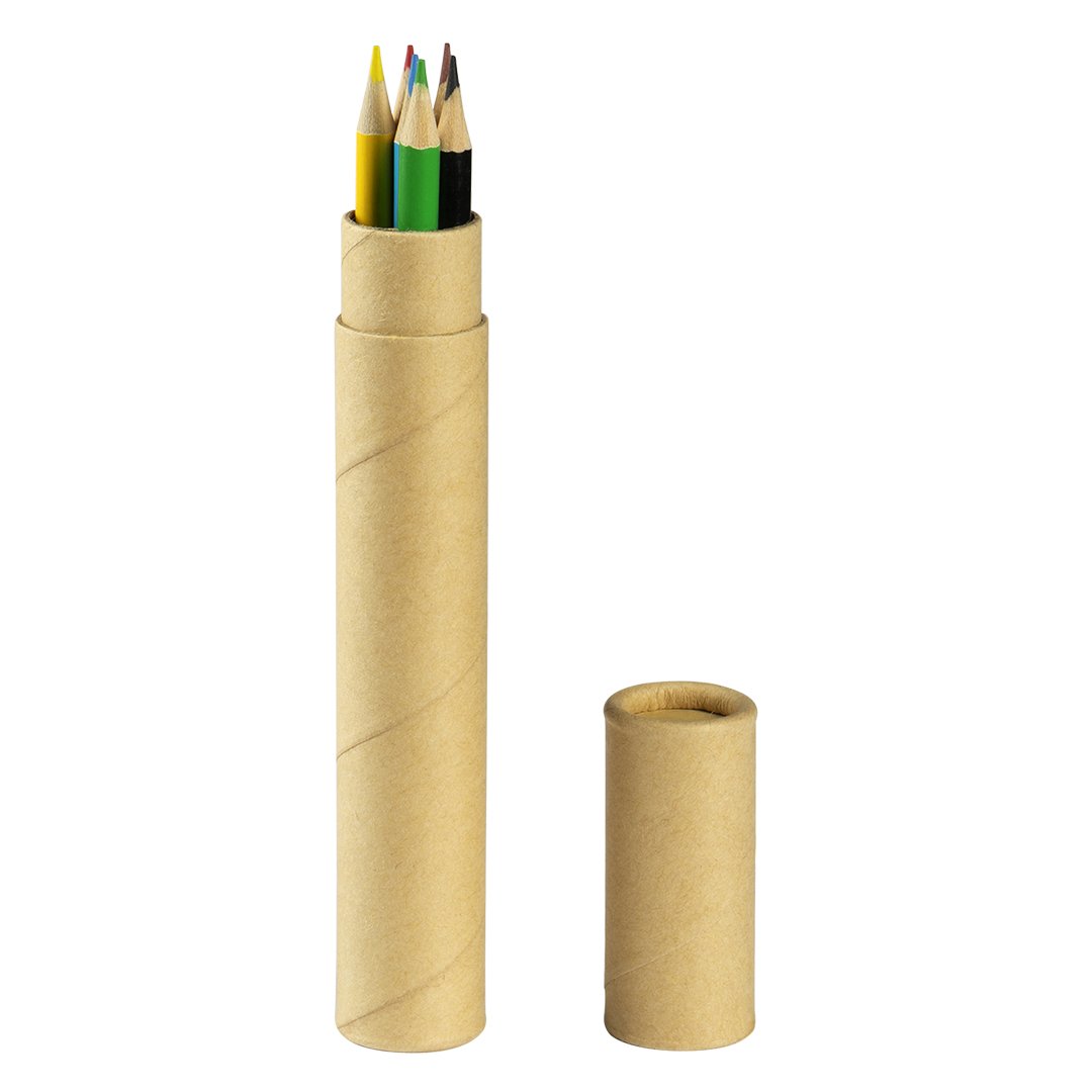 Set od 6 drvenih bojica upakovanih u kraft kartonsko pakovanje cilindričnog (valjkastog) oblika. Bojice su kružnog tela sa sjajnom završnicom u različitim bojama, što im daje uredan i atraktivan izgled. Kompaktno i praktično rešenje za školu, kreativne radionice i promotivne aktivnosti.