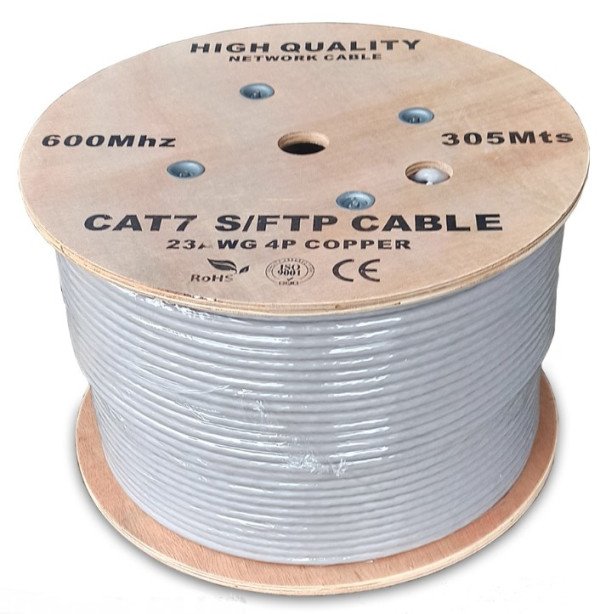 PRIKAZANA CENA JE ZA PAKOVANJE OD 305M. Ovaj S/FTP kabl ne prodajemo na metar. Kabl je upakovan na “drum” tj. drveni kotur. Poprečni presek žice jedne parice je pun a ne licnasti i namenjen je za ugradnju u zid. Materijal žice je od čistog bakra (CU). Prikazana slika je prava slika kabla. Razlika između S/FTP i FTP kabla je ta što su kod FTP kabla sve 4 parice (osam žica) obmotane aluminijumskom i celofanskom folijom i štite parice od elektromagnetskog uticaja drugog kabla ili kablova u blizini, dok su kod S/FTP svaka parica obmotana foliom posebno, a sve parice zajedno obmotane i sa sirmom tj pletenicom. Razlika između CAT5 i CAT6 utp kabla je u tome što je poprečni presek provodnika nešto veći i kod CAT6 kabla postoji separator (izolator) koji odvaja parice. Za direktno krimpovanje CAT7 wall kablova pogledajte poseban konektor na ovom linku. Ispravnost već postavljenog UTP kabla ili raspored žica u nekom od novih ili već postojećih RJ konektora testirajte sa LAN testerom. LAN tester za UTP i FTP kablove iz naše ponude pogledajte ovde.
