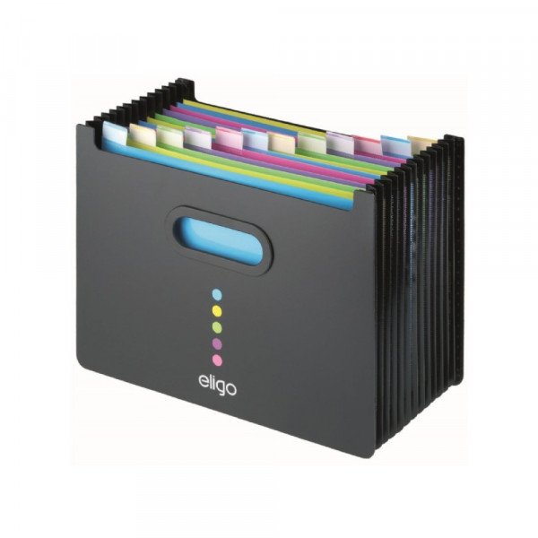 Elegantan položeni proširivi organizator za radni sto i policu. Odličan način sortiranja i arhiviranja dokumenata – posebno tamo gde je prostor za čuvanje ograničen. 13 proširivih odeljaka za papire i dokumente. Isporučuje se sa plastikama za obeležavanje. Spoljašnost izrađena od čvrstog 1,8 mm Eligo crnog polipropilena.