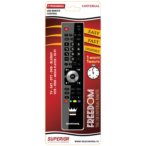 Pogramirajuci daljinski upravljac do tacno 4 definisana uredaja,(TV, DVD, BlueRay,SAT), Programiranje na PC-u preko Micro USB kabela, Pakovanje: Freedom PC daljinski upravljac, Micro USB/USB kabel.