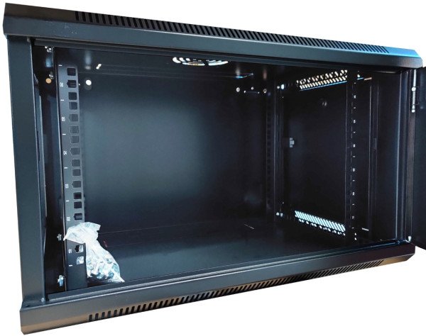 Kuciste sadrzi: 4 Šine, bez ventilatora, jedan otvor za ventilator, 15 kaveznih matica, RAL9004, sklopljeno pakovanje