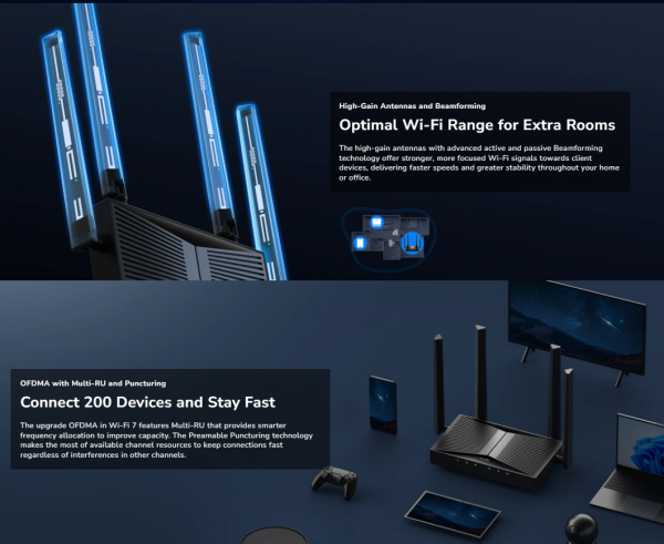Dual-band Wi-Fi 7 ruter sa ukupnom brzinom od 3,6 Gbps i pet Gigabit portova, namenjen za gejming i zabavu.
