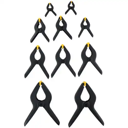 KINZO Set 10 opružnih štipaljki Opružne štipaljke su alatke ili uređaji koji se koriste za držanje ili stezanje predmeta. One imaju oprugu koja omogućava automatsko stezanje kada se pritisne ručica. Ove stezaljke se koriste u različitim situacijama kao što su drvodelja zavarivanje modeliranje i slično gde je potrebno držati delove na mestu dok se izvodi određeni rad. Sadržaj seta 2x Štipaljka sa mogućnošću stezanja od 0 do 105 mm Dužina 210 mm 3x Štipaljka sa mogućnošću stezanja od 0 do 75 mm Dužina 150 mm 2x Štipaljka sa mogućnošću stezanja od 0 do 45 mm Dužina 110 mm 1x Štipaljka sa mogućnošću stezanja od 0 do 35 mm Dužina 90 mm 2x Štipaljka sa mogućnošću stezanja od 0 do 27 mm Dužina 65 mm
