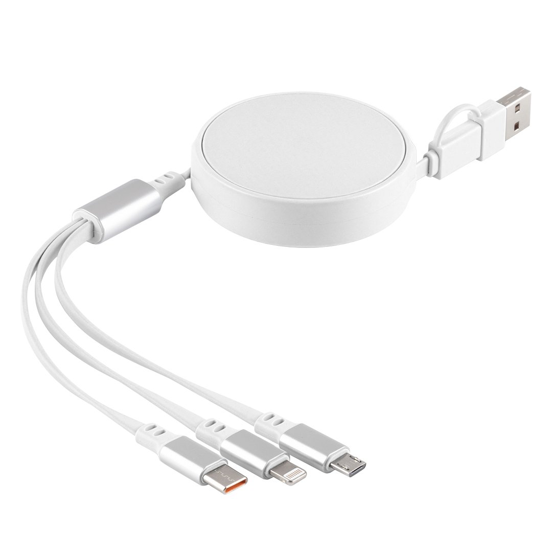 Materijal: plastika, aluminijum • Dužina kabla: 1 m • Tip kabla: uvlačeći (automatsko uvlačenje) • Ulaz: USB-A/Type-C • Izlazi: Micro-USB, Lightning, Type-C • Snaga punjenja: do 60 W (Type-C/Type-C) • PD (Power Delivery) funkcija • Soft touch završna obrada • Funkcije: Punjenje i prenos podataka • Kompatibilno sa uređajima: pomoćne baterije, mobilni telefoni, tableti, laptopovi • Poklon pakovanje