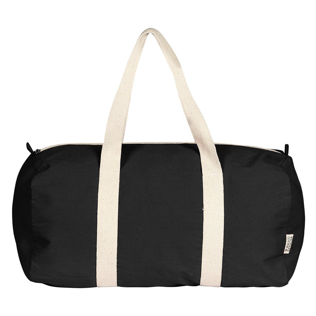 Putna i sportska torba • Sirovinski sastav: 80% reciklirani pamuk, 20% reciklirani poliester • Gramatura: 320 g/m2 • Cilindrični oblik • Glavni odeljak sa rajsferšlusom • Čvrste ručke od pamučne trake • Kontinuirano prošivena konstrukcija • Pogodna za sport i putovanja • Eco koncept • Kraft hang tag etiketa • Vezena eco etiketa • GRS sertifikat • OEKO-TEX sertifikat • FAIRTRADE sertifikat