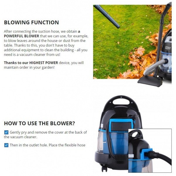 Usisivač sa mokrom/suvom filtracijom Zilan, 2000W, crveni, pomaže vam da očistite najnepristupačnije površine do poslednjeg zrna prašine, ostavljajuc´i vaš tepih savršeno čistim.