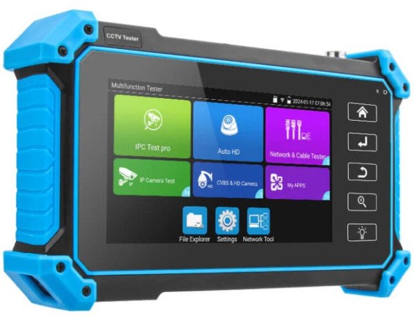Šta je u kutiji: CCTV tester *1, DC kabl za napajanje, Adaptor*1, RS485 kabl *1, BNC kabl *1, audio kabl *1, sigurnosni kabl *1, torba za alat *1, priručnik *1