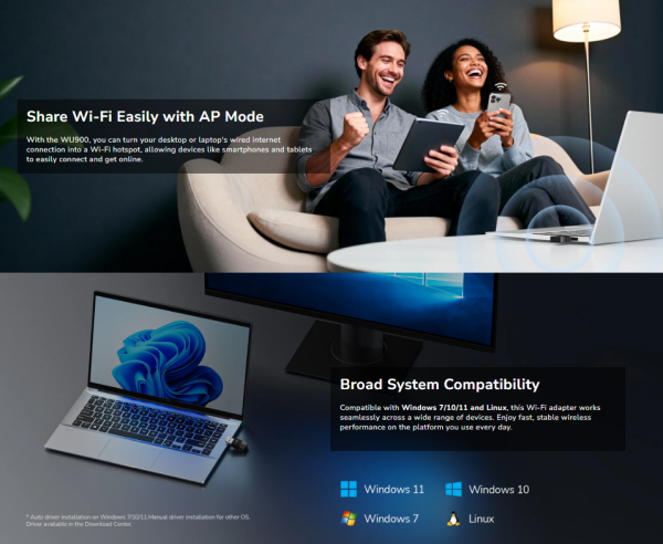 -Kompaktan USB adapter sa dvostrukim opsegom koji podržava Wi-Fi 6, pružajuci visokobrzinski rad sa niskom latencijom za glatko online igranje i brza preuzimanja na vašem gejmerskom PC-u ili laptopu.
